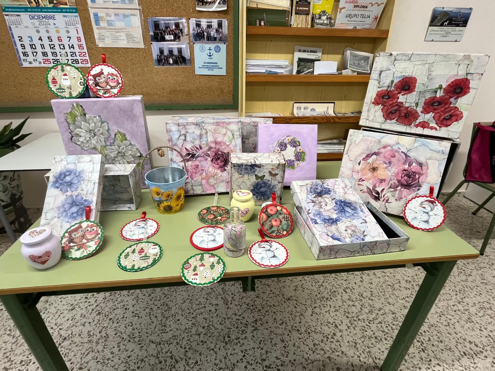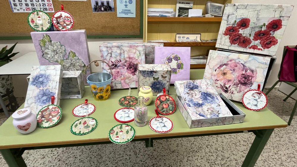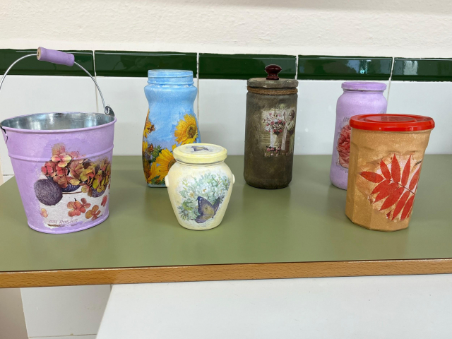 2025-01-13 PRIMEROS TRABAJOS DEL TALLER DE MANUALIDADES En este trimestre hemos finalizado el Taller de Decoupage. Estos son algunos de los trabajos Hemos decorado tarros, cajas y Dvds El próximo trimestre comenzaremos la iniciación al ganchillo.